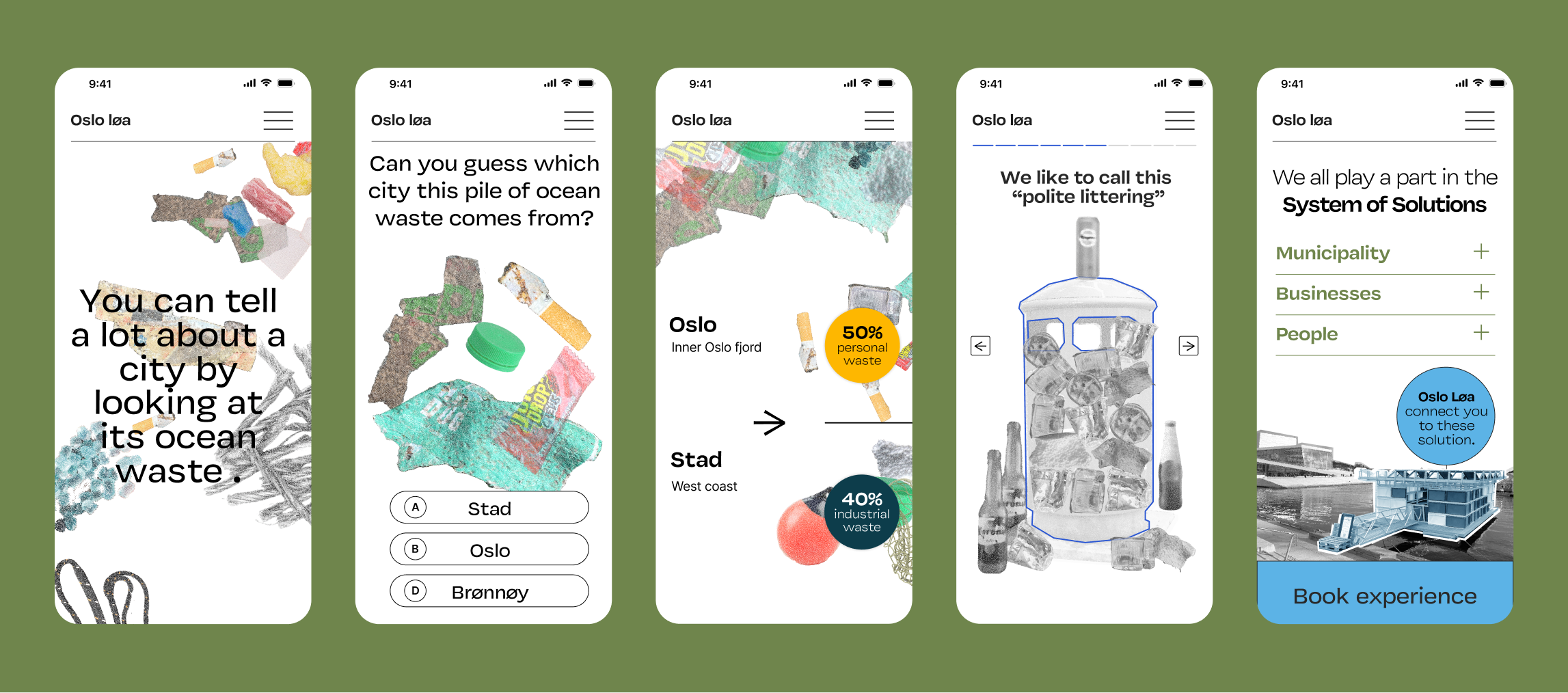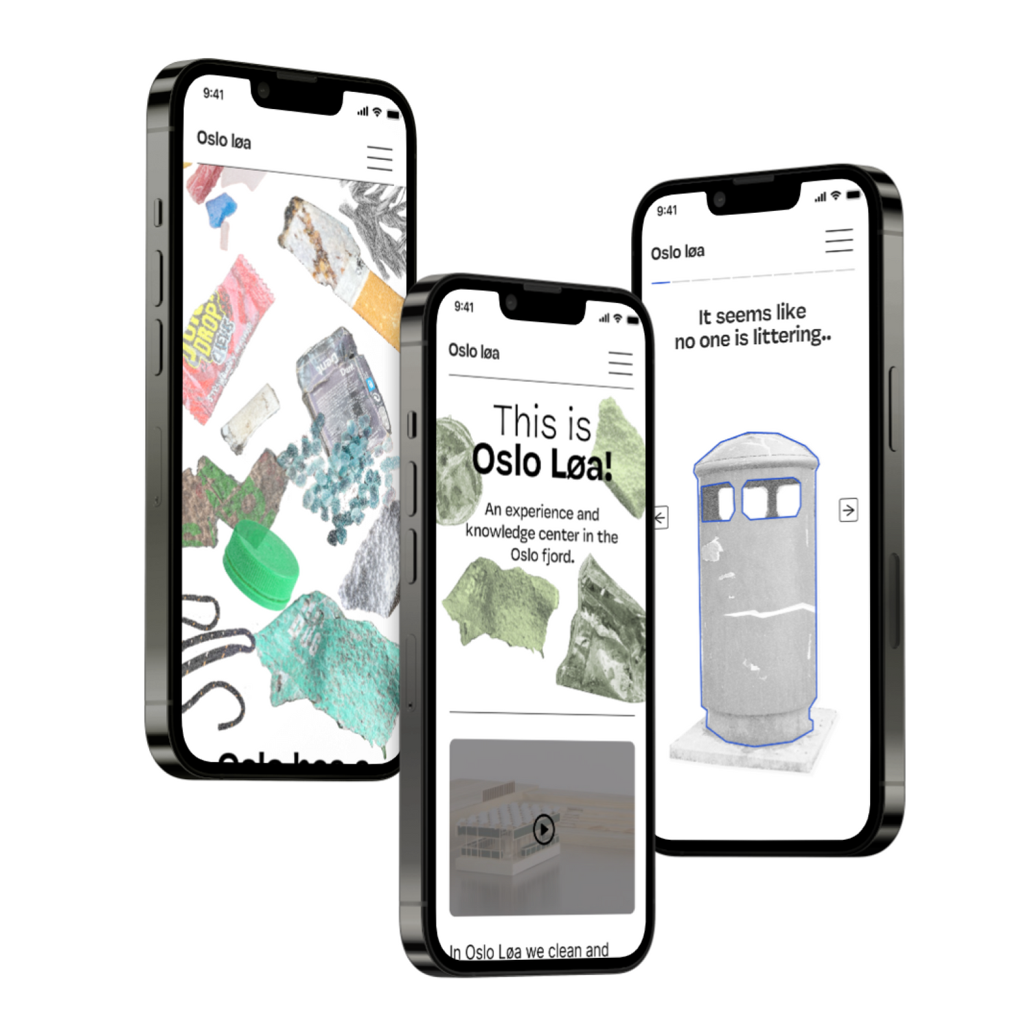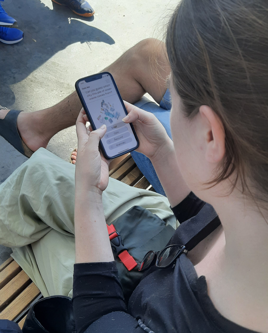 The final design was kept limited to a mobile phone for an easy entry point. It was a guided digital experience divided into 3 parts. The animation was added to waste images to set the theme of marine litter floating in the fjord. We use a lot of local storytelling, for example, using the scenario of a trash bin in Oslo and how it ends up in the Fjord. The buildup from the first and second parts is concluded in the end to make sense of Oslo Løa's purpose and how they can be part of the solution.